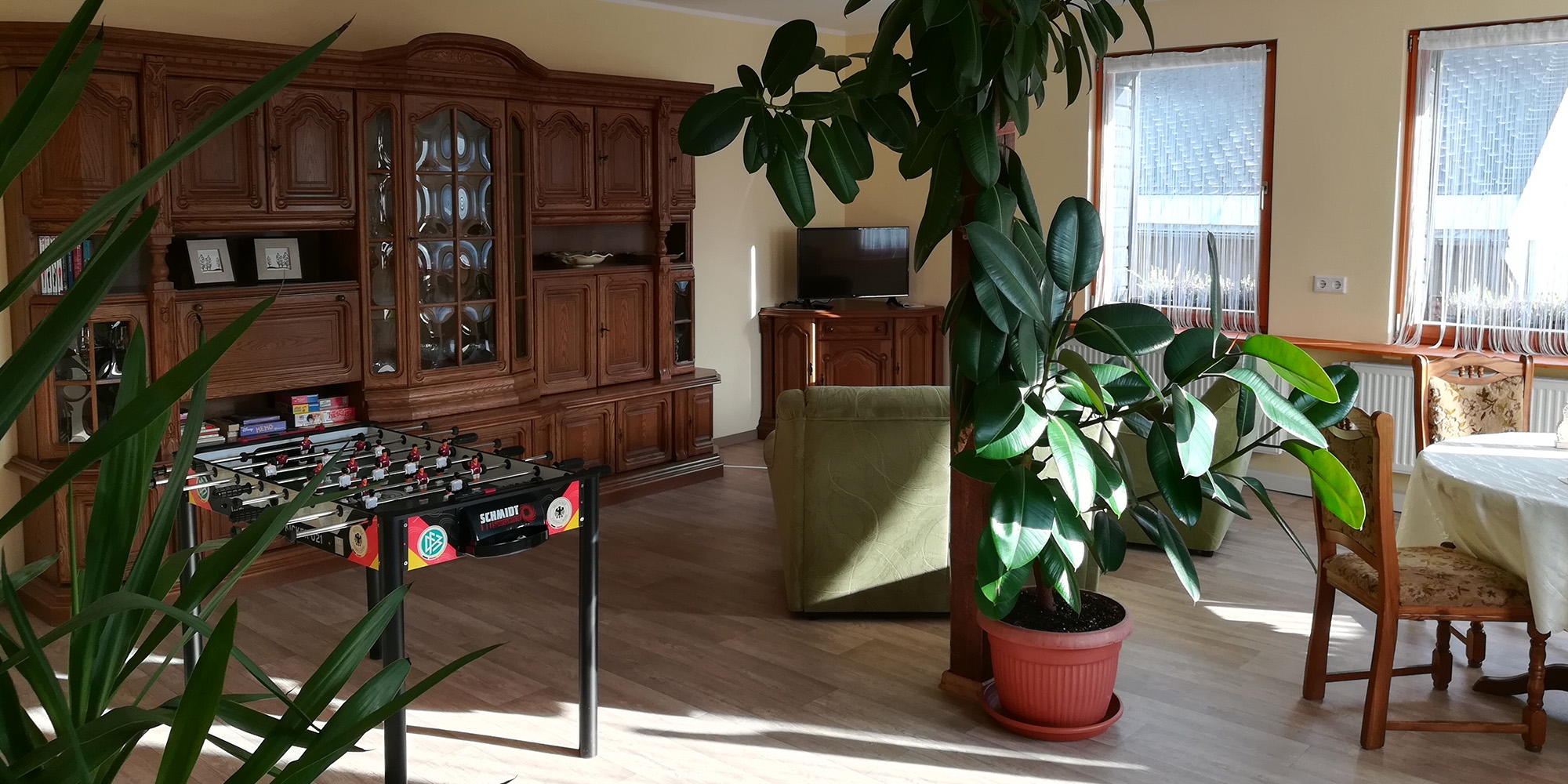 Im Erdgeschoss befindet sich zudem ein großzügiger Gemeinschaftsbereich mit einer Gästeküche (mit Herd, Backofen, Mikrowelle, Kaffeemaschine, Wasserkocher), mit TV, Tischkicker, einer kleinen Bücher- und Spieleauswahl.